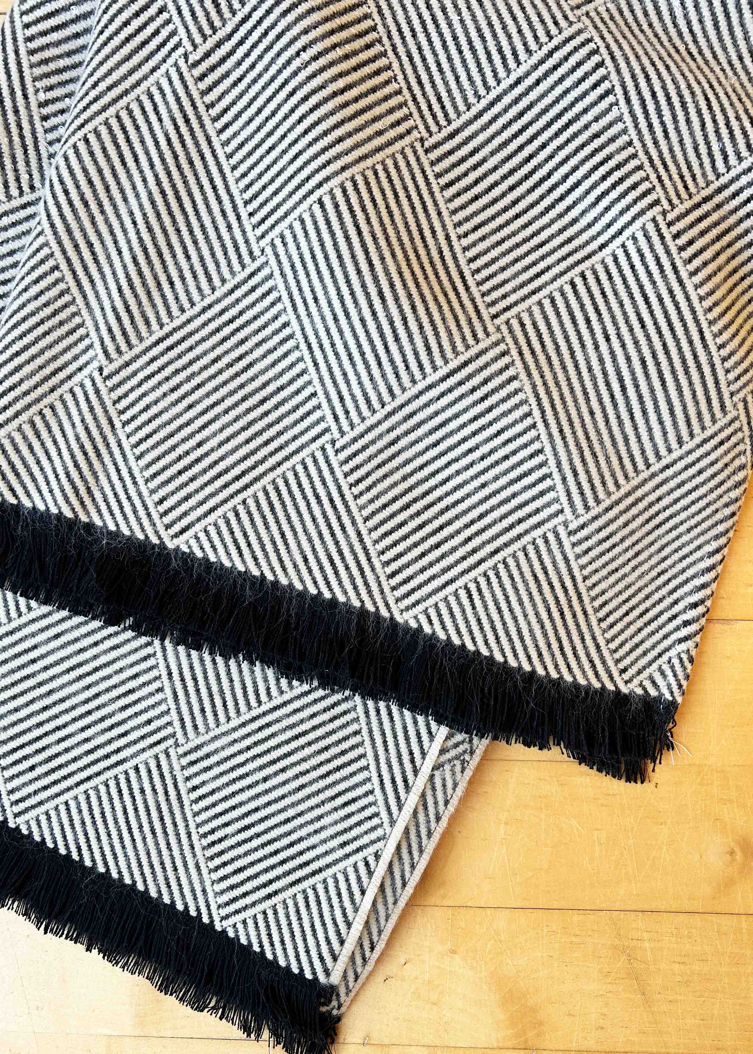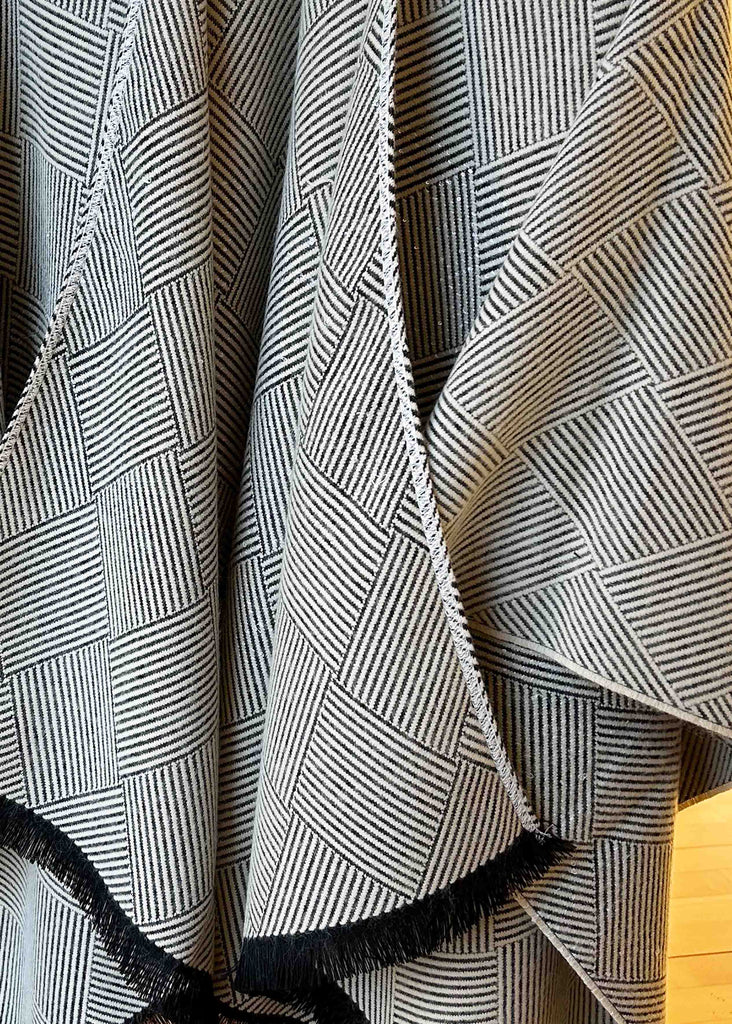 Our wraps are a great layering piece for extra warmth and ideal if sleeves prove difficult to get on being sleeveless. The squared off shape at the neck, helps to keep the wrap securely on your shoulders. The gorgeous Lianne wrap has an elegant salt & pepper and herringbone design. Length 27.5" (70cm).