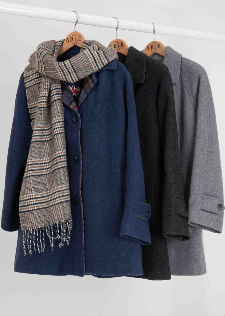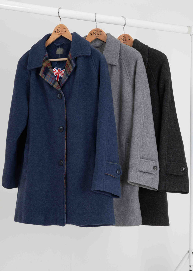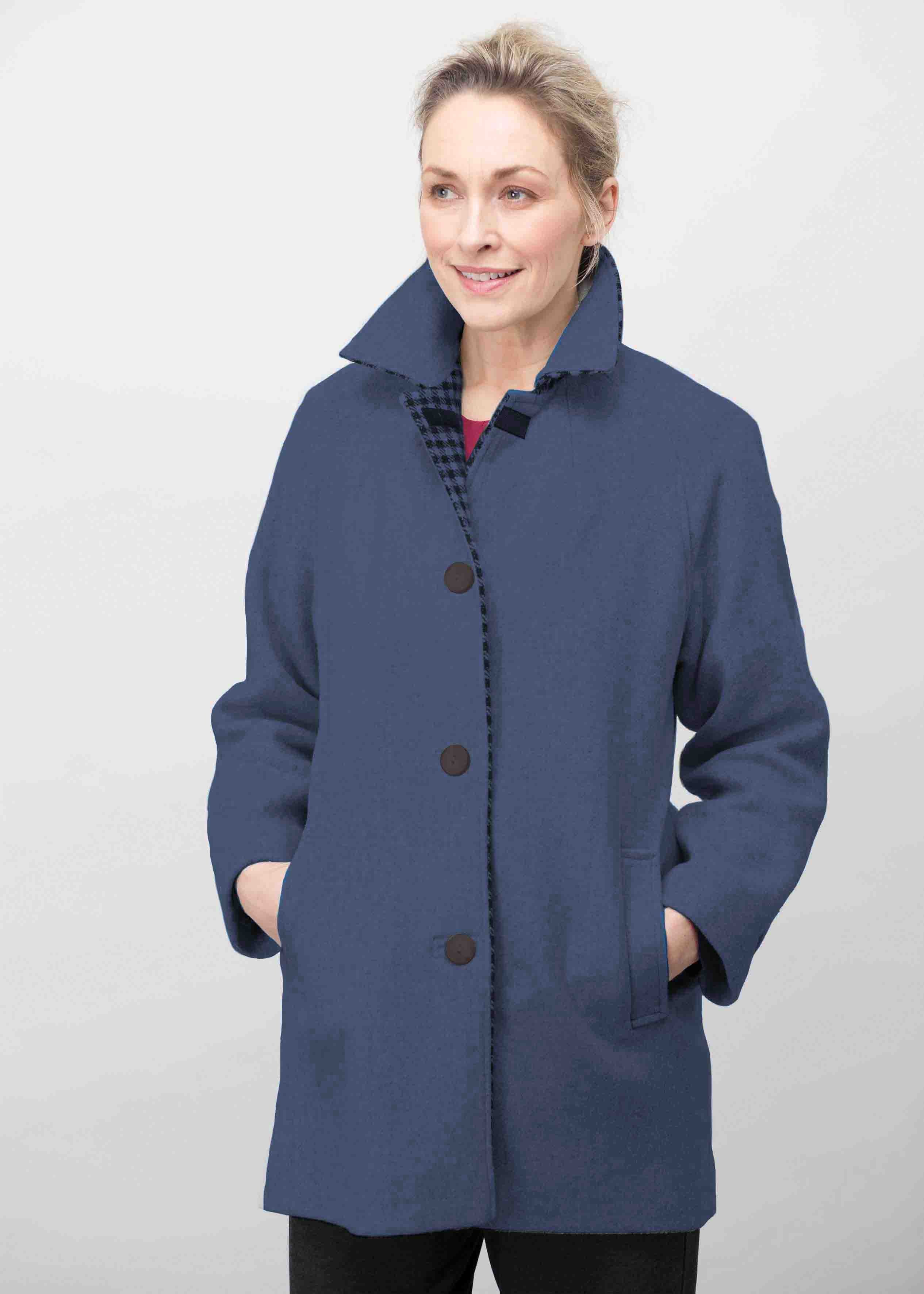 Our timeless warm wool blend fabric coat has buttons but for display only. The coat actually fastens with VELCRO® encouraging independent fastening. The stylish collar with contrast check trim will keep the cold off your neck and the pockets are practical and will keep your hands warm. Raglan sleeves and a slippery lining make it easier to get arms into and out of armholes. Length 32.5" (83cm).